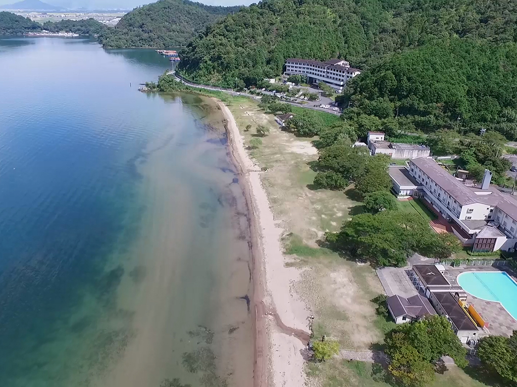 ▲波打ち際まで芝生が広がる遠浅のビーチ