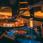 キャビン内には、大型冷蔵庫や冷凍庫、最新の調理家電や調理道具、食器やカトラリーを完備。ウッドデッキには焚火台兼バーベキューグリルを備える。