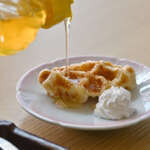 夕食・朝食ビュッフェのデザート「クロワッサンワッフル」は、クロワッサンの生地をワッフルメーカーで焼く、地産の蜂蜜やアイスクリームなどをトッピングした。子どもから大人の方まで大人気のメニューだ。五色台の山で採れた蜂蜜やアイスクリームなどをトッピングすればおいしさ倍増。