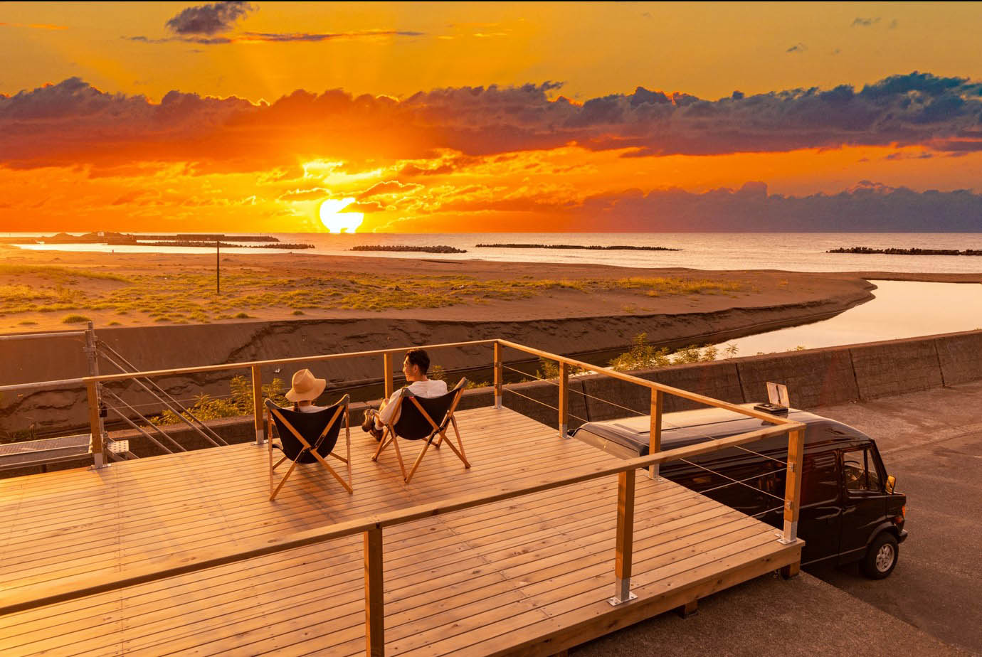 鯨波海岸に直結した立地と一部サイトにある専用の屋上デッキが魅力なRVパークが「RVパーク SBP サンセット ビーチ パーキング」。目の前の海に沈む夕陽に心が洗われていく感覚は、写真からもイメージできるはずだ。