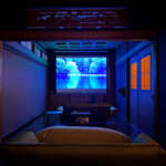宿泊棟は、ソファー、ビーズクッション。和室にはこたつを用意。家族での滞在中に子どもが飽きないよう、トランポリンなどの遊び道具が充実しているほか、室内ではプロジェクターでアニメやYouTubeなどを観賞できる。