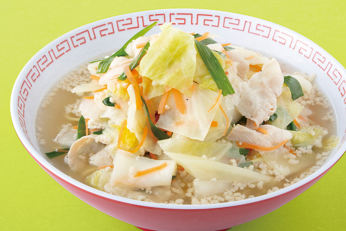 ▲不足しがちな野菜をしっかりと摂ることのできる、たっぷりの野菜と豚肉を使用。スープは鶏ガラベースの塩味で、野菜の甘味や旨味がしっかりと伝わる味わい深い味付け。麺は卵の風味豊かな細麺を使った、かわしまファーマーズテーブルの名物メニュー