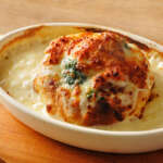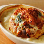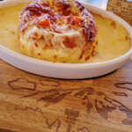 滑らかなホワイトソースとパンの上からこぼれるほどのチーズをかけて器ごとオーブンで焼き上げ、熱々の状態で提供する。
