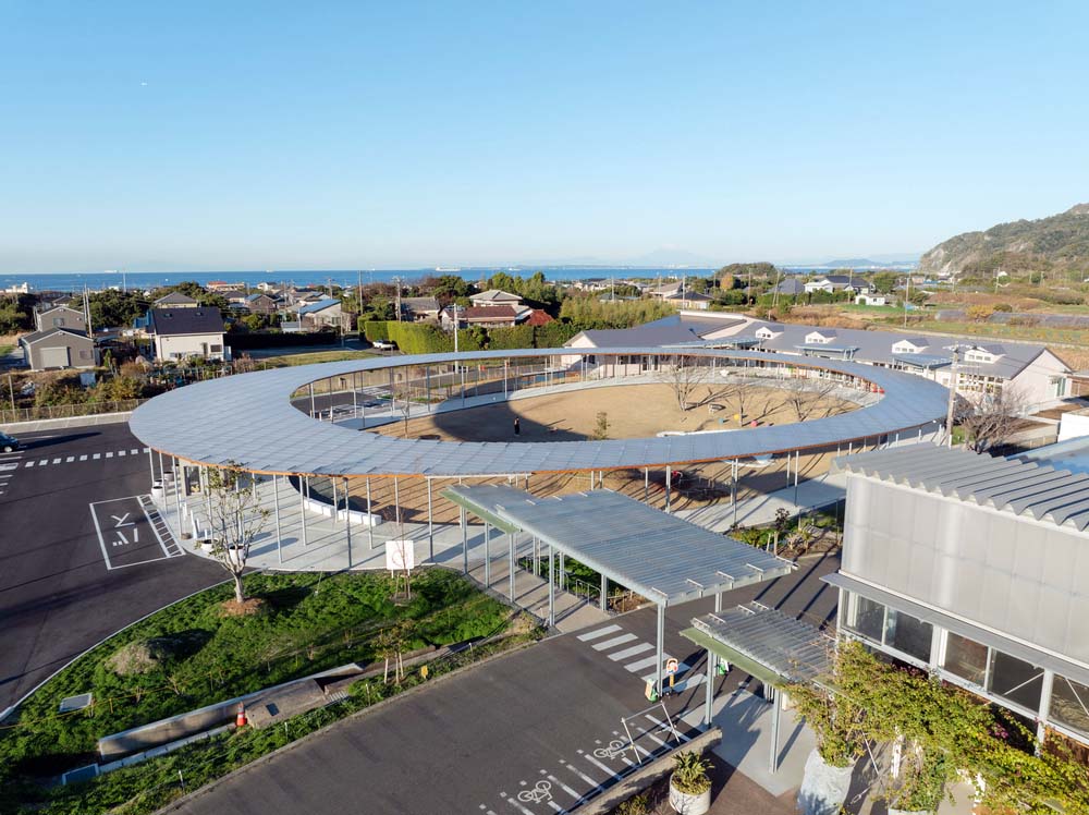 幼稚園の教室は飲食店やショップ、遊戯室はプレイカフェ、職員室や保健室はワーキングスペースに生まれ変わり、園庭の広場を囲む大きな屋根付きの歩道「わっか」はシンボルとなっている。