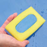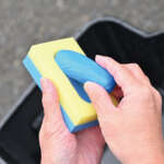 ④スポンジはちょうど片手でつかめるサイズ。バケツ一杯の水があれば作業ができるので、水道のない駐車場などでも便利だ