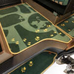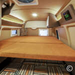 シート生地は世界観を感じさせるグリーン、ベージュ、オレンジをあしらったアート柄で、リヤベッドは太陽の光を浴びた大地を表現したオレンジ一色。