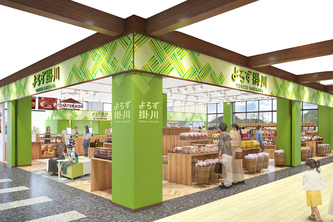 今回のリニューアルでは、ショッピングコーナー「よろず掛川」大幅にリニューアル。静岡県産のお茶や銘菓をはじめ、新鮮な野菜や果物が並ぶ青果コーナーなどを設置する。