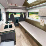 インテリアはLOGOSの世界観を表現。ベッドにもなるベンチソファが右側にレイアウトされ、エントランス側にシンクを配置。シンク側には3通りの取り付けができる、取り外し可能なテーブルも装備。リアサイドには、特別なグラフィックが施されたエアコンも装備可能。