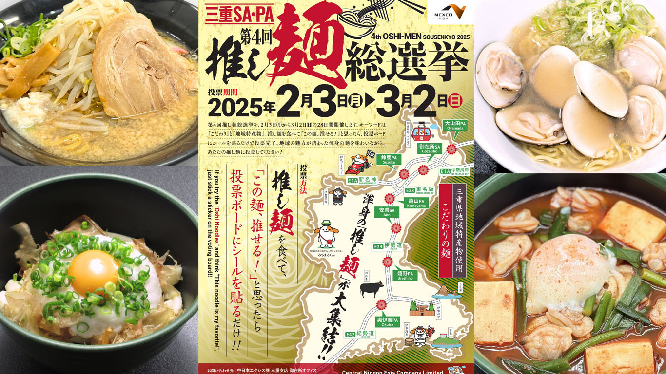 中日本エクシス三重支店は、三重県内のサービスエリア(SA)パーキングエリア(PA)の店舗(一部除く)で、2月3日(月)~3月2日(日)の期間、自慢の麺料理No.1を決定する「第4回 三重SA・PA 推し麺総選挙」を開催。