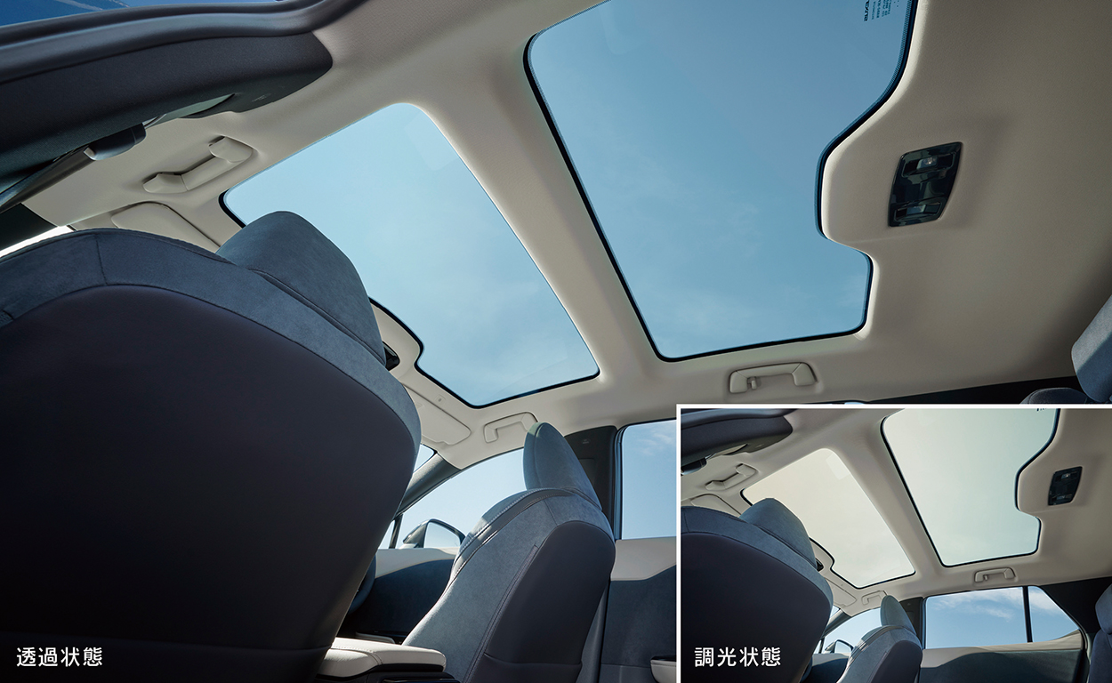 ▲パノラマルーフは、床下へのバッテリー搭載によって室内高が低くなるためサンシェードを廃止。レクサス初の調光機能によって、一瞬で遮光が可能