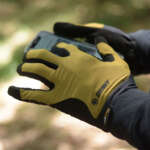掌側はAXスエード(人工皮革) でグリップ力、耐摩耗性、肌触りのよさを狙っている。スマホ対応素材なので、手袋をつけたままでタッチ操作が可能だ。汗をかいても快適に過ごせ、春〜秋の山行に最適。