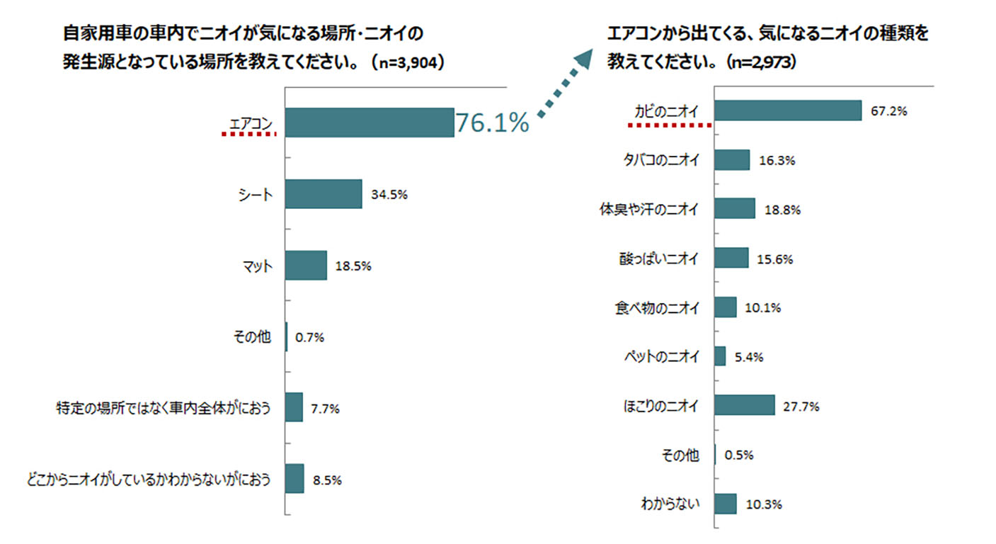▲カーメイトが行ったアンケートでは「エアコンのカビ臭」が気になる臭いの第1位