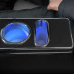 素材は丈夫で長持ちするPVCレザーで高級感あり。カップホルダー部とスマホ収納部はスイッチを押すだけでLEDライトが点灯。夜間の荷物の位置確認、収納ボックスから荷物の取り出しが簡単で、明るさは3段階に調整できる。