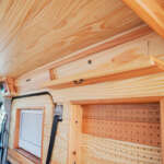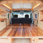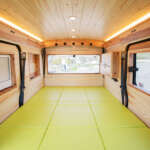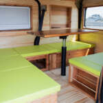 内装には、車内を取り囲むように天然の彬を採用。天井にはハンガーフックとしても活用できる5穴ロッドホルダーを装備。格納式のオーバーヘッドシェルフが計4箇所あり、停車時のキャビネットとして利用可能。