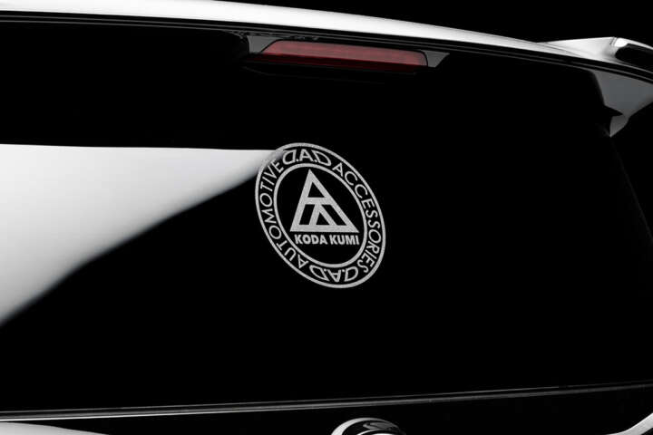 ▲サークルステッカー DKK013-01-01(5000円)。リヤウインドーに貼れる円形タイプのステッカー。プライバシーガラスにシルバーのロゴが映え、後ろ姿が個性的に