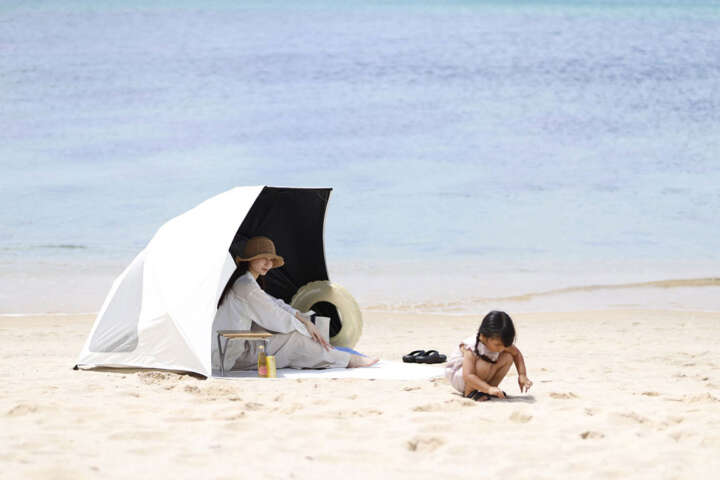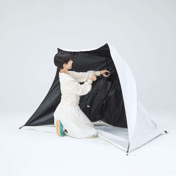 内部の反射が少ないので、まるで深い木陰のような涼しさが味わえる。遮光性が高いので日焼け対策にも威力を発揮。テントとは異なり、出入口が高く広くなっており、開放的な空間でリラックス。