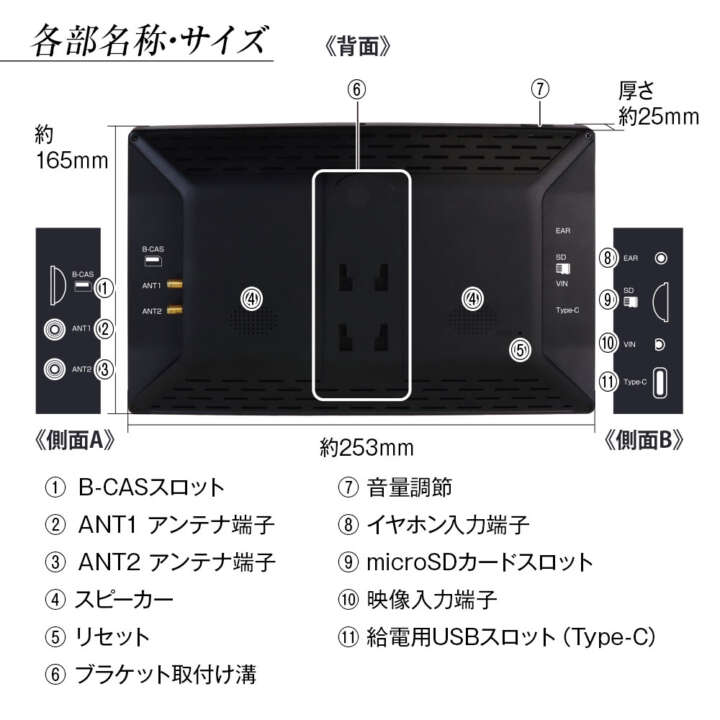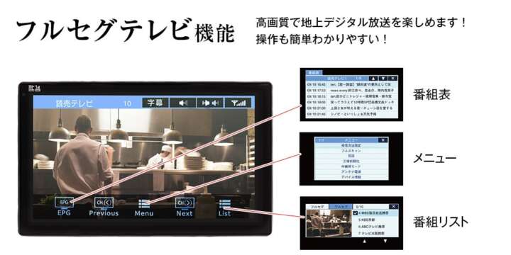 本体機能には2チューナー×2アンテナ方式のフルセグ地デジを搭載しており、テレビの視聴も可能。ディスプレイは広視野角のIPS液晶でWSVGAの高解像度(1024×600)。市販バックカメラを接続して車両後方の映像表示も行える(付属の映像入力ケーブルを使用)。