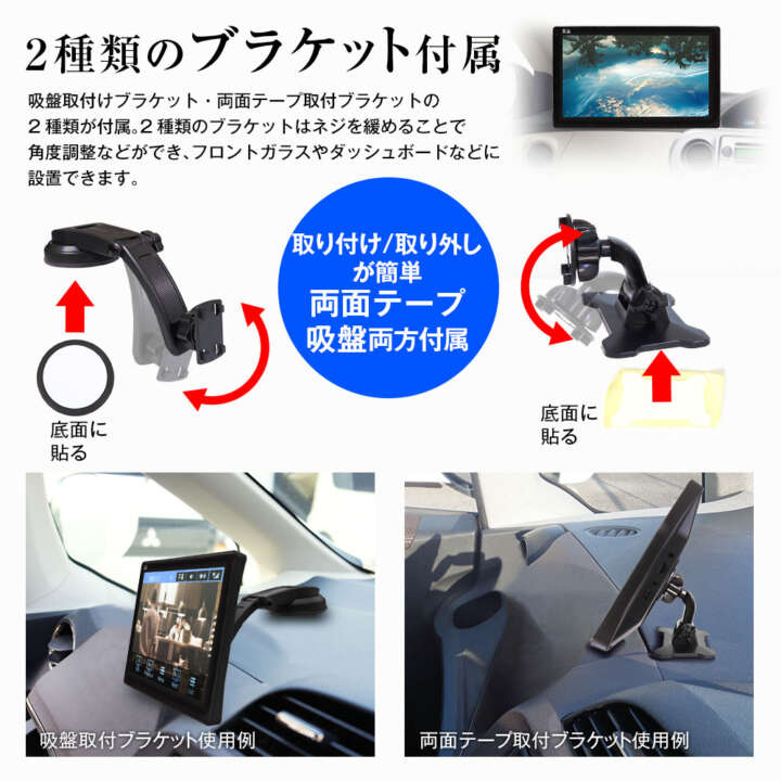 車両への装着は付属している吸盤取付ブラケットまたは両面テープ取付ブラケットを利用し、簡単で確実にダッシュボードに固定できる。