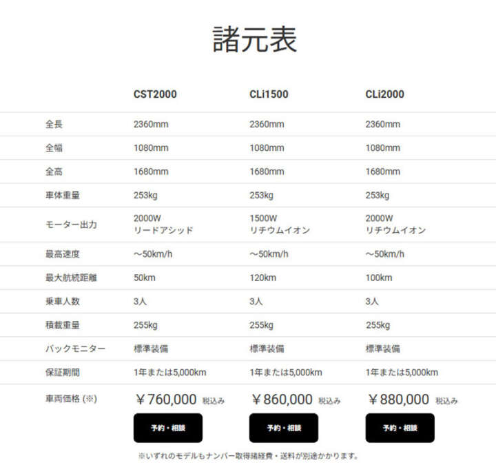 モーター出力は1500Wまたは2000W、バッテリーはリードアシッド仕様とリチウムイオン仕様をラインナップ。モデルは「CST2000(2000W・リードアシッド)」航続距離約50km、76万円。「CLi1500(1500W・リチウムイオン)」航続距離約120km、86万円。「CLi2000(2000W・リチウムイオン)」航続距離約100km、88万円。