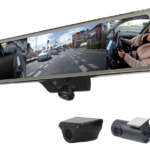 ルームミラー型の本体には吊り下げるように360°カメラを搭載し、車両前方や側方、車内を一度に撮影できる。