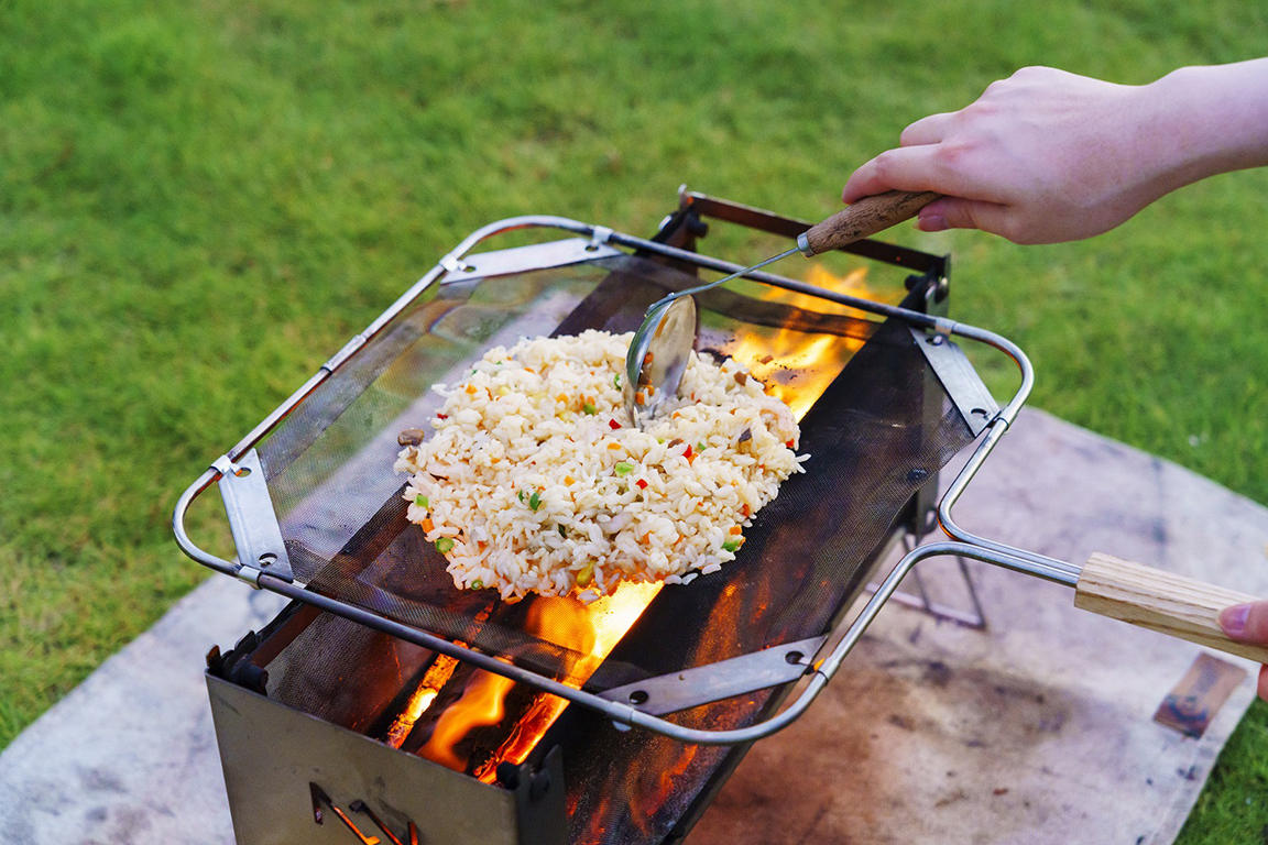 福岡最大規模の水門メーカー、乗富鉄工所が焚き火周りのプロダクトを提案するブランド「ノリノリプロジェクト」から、ステンレスを編み込んだ直火焼専用のメッシュ式フライパン「メッシュパン」が発売された。