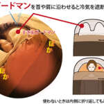 「すきまガードマン」を首や肩に沿わせることで冷気をシャットアウトするうえに、ドローコードを絞ればさらに強力に冷気を遮断できる。