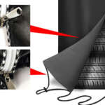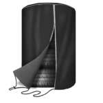 4本平積みしたタイヤの上からすっぽりと被せられる。ファスナーによる開閉ができて下部の締め付けロープで風によるめくれも防げる。