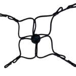 サイズはSmall(伸縮サイズ:85センチ×85センチ)とLarge(伸縮サイズ:150センチ×150センチ)を用意。ロープ本体は直径5mmのゴム紐を採用し、金属ファスナー、プラスチックバックル、金属スタッドを組み合わせ強度を確保した。