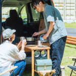 天板をリアゲート外に持ち出してアウトドアチェアと組み合わせれば、便利なテーブルに変身。アウトドアでゆっくり寛げる。