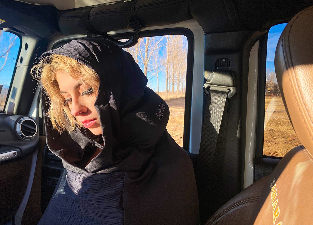 ▲特大メッシュフード付き。光を和らげるだけでなく顔も隠せる