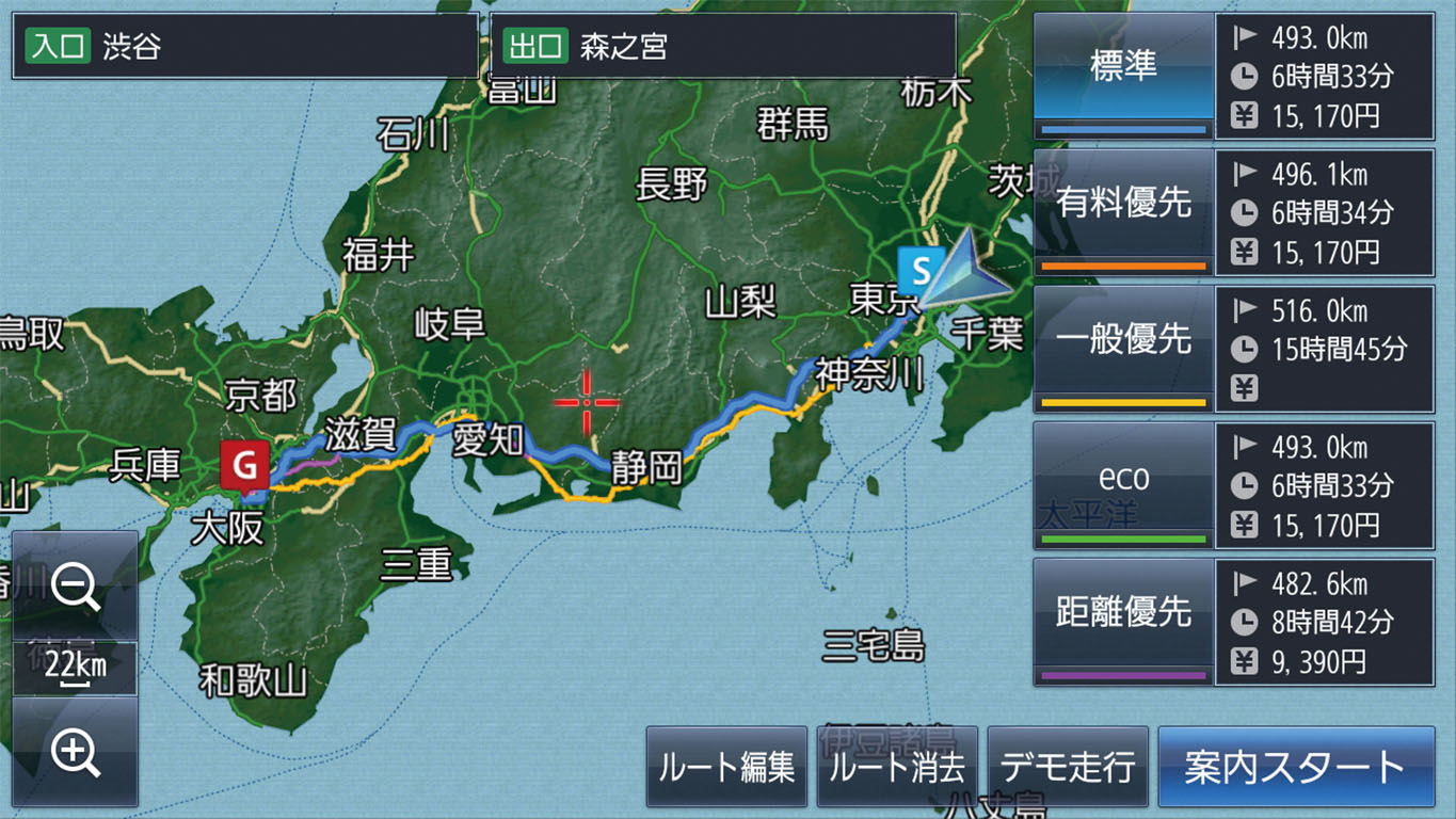 ▲「標準」「有料優先」「一般優先」「eco」「距離優先」の5ルートを同時に素早く探索してくれ、自分の好みのルートを選べる