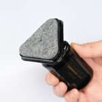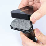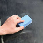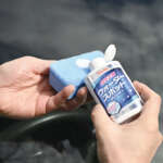 ▲ガラスが手で触っても熱くないことを確認してから塗り込む。フェルト面をガラス面に軽く叩くようにすると、液剤がフェルトに染み出す