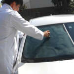 ▲同社の「ガラス用ウォータースポットクリーナー」を使用して、油膜などをキレイに落としてから作業を開始。ガラスをマスキングテープで半分に仕切り、左側だけ塗布して施工前後の様子を検証してみた