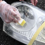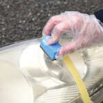▲作業前にシャンプーなどで洗って水滴を拭き取っておく。コーティング済みの場合には除去が必要だ。始めに「眼神のクリーナー」を青いスポンジの黒い面に適量つけ表面を磨いていく