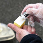 ▲「眼神のコート」を黄色いスポンジの白い面全体にしっかりと染み込ませて、塗り筋が残らないように一定方向に一度塗りで仕上げれば完成。塗布後24時間は触ったり、濡らしたりしないこと