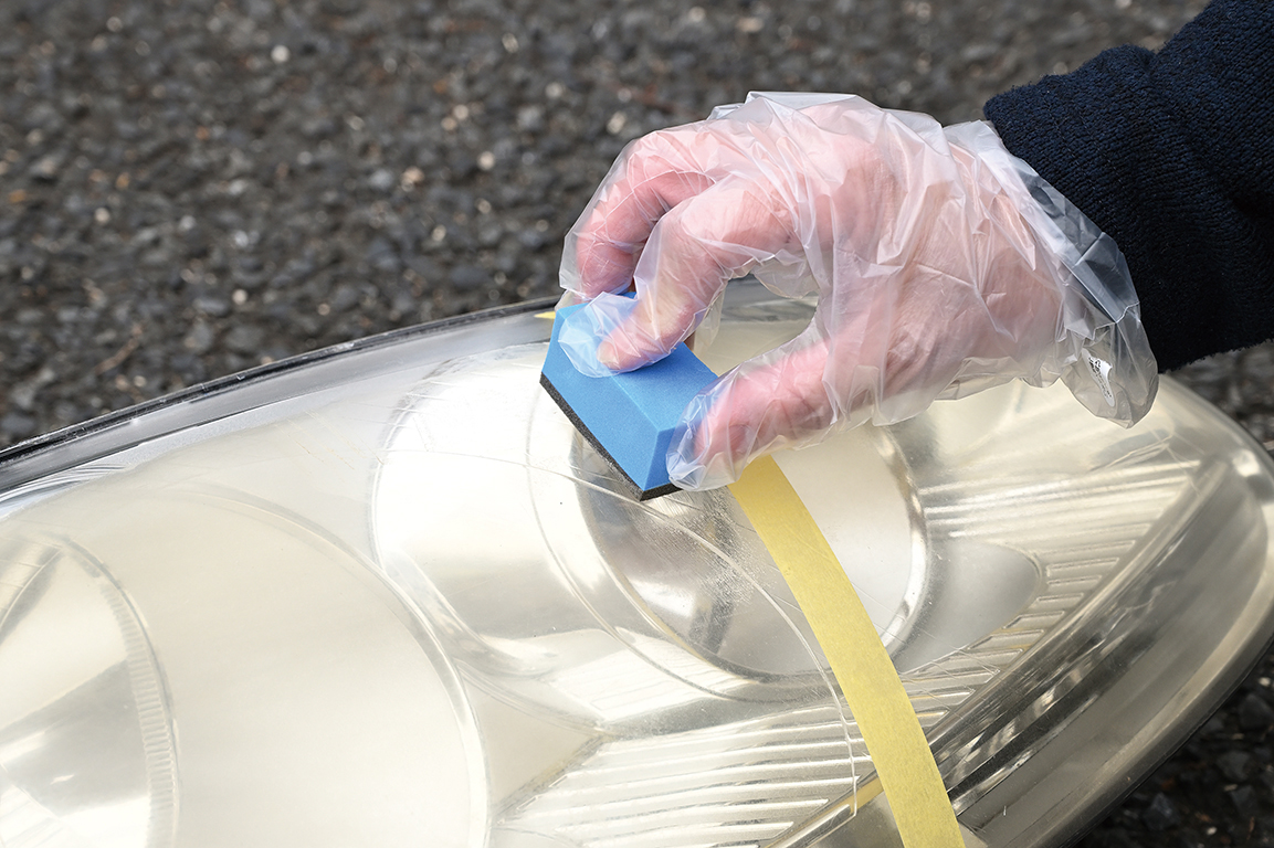 ▲作業前にシャンプーなどで洗って水滴を拭き取っておく。コーティング済みの場合には除去が必要だ。始めに「眼神のクリーナー」を青いスポンジの黒い面に適量つけ表面を磨いていく