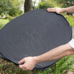 フロントウインドウに立てかけ、サンバイザーで押さえるのは一般的なサンシェードと同じ。たたむ際には二つ折りにした状態で8の字にひねり、端に取り付けられているゴム紐をかければOK。