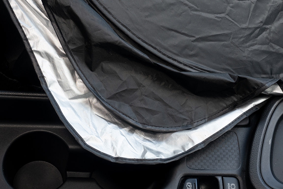 ▲車内側は黒いナイロン生地、外側はシルバー色のコーティングが施されている