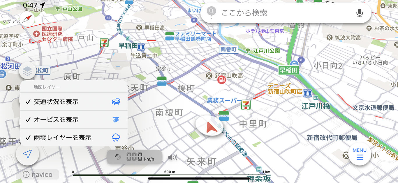 ▲サブメニューの「地図レイヤー」で、交通状況、オービス、雨雲の情報表示選択を行える