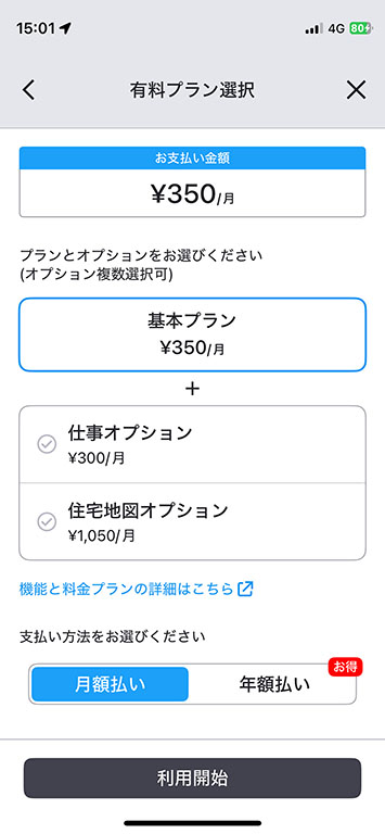 ▲基本プランは月額350円または年額3800円。有料カーナビアプリとしては価格設定がお手頃だ