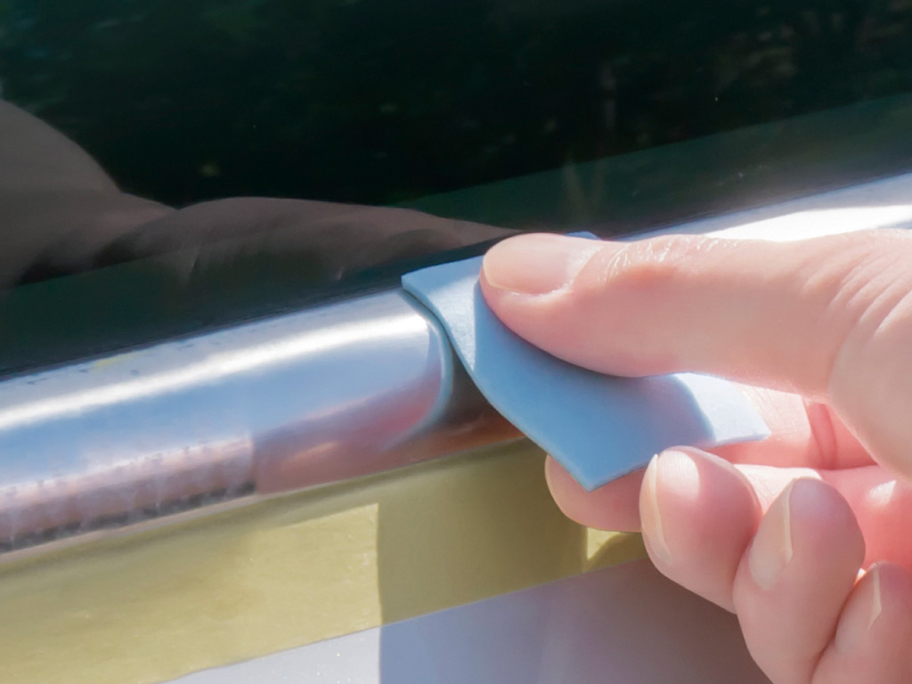 ▲付属の保水研磨スポンジは、モールの曲面にしっかりフィット。保水用のトレーやコーティング剤用スポンジも付属している