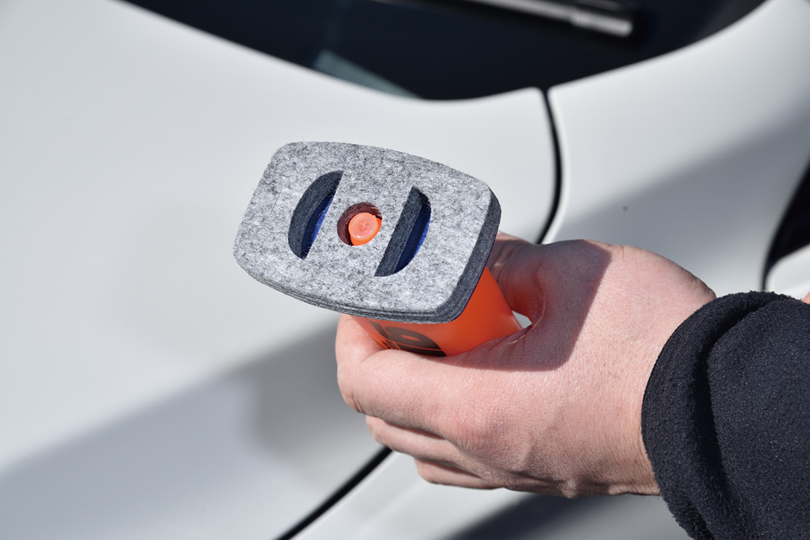 ▲ワイドスクエアフェルトは厚みがあり、液剤の染み込みも十分。ネジキャップ付きなので保管も安心