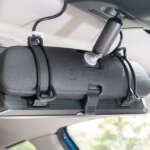 ▲本体は純正ルームミラーに被せて付属のゴムバンドで固定する