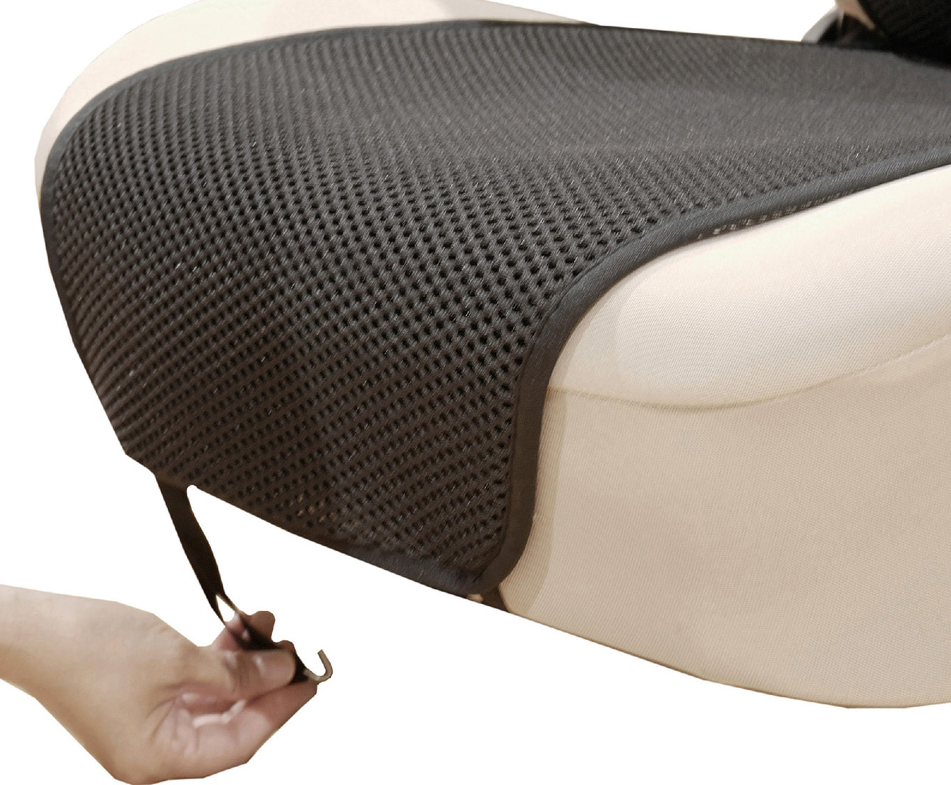 ▲ヘッドレストにはベルトをかけ、座席の下はSカンフックで引っ掛けることでしっかり固定