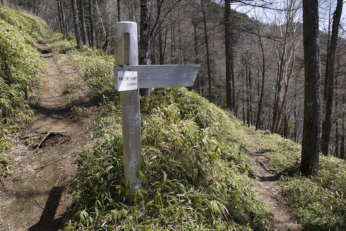 ▲笠取小屋方面に向かう途中で斜面を下る道があり、道標もあります