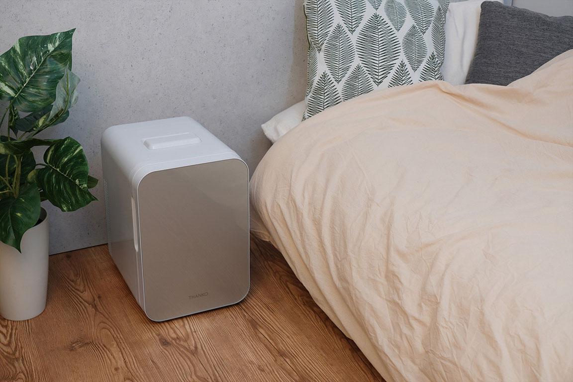 ▲電源ケーブルのほかシガーケーブルも付属しているので、家でも車内でも使用できるのが便利。ペルチェ式の静音設計のため、ベッドサイドにも起きやすい。スタイリッシュなデザインなので、部屋の雰囲気も壊さない