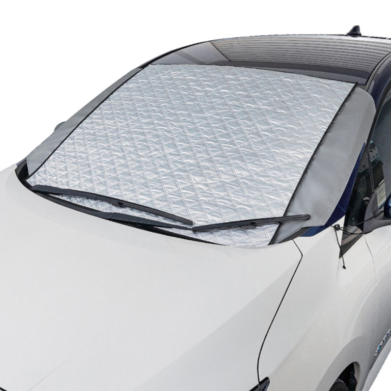 ▲ウインドウに被せたら、ヒモでドアミラーに固定する。フラップをドアに挟んで固定すれば完成