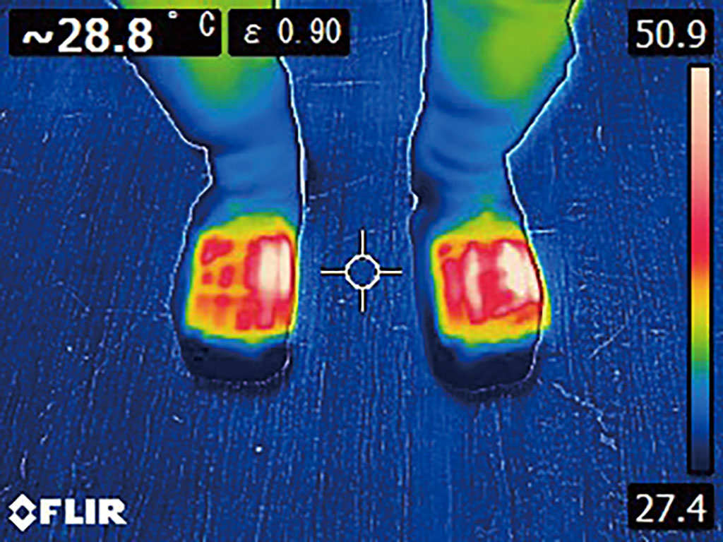 ▲サーモグラフィーでは、使用後は足の甲部分が赤くなり温かくなっていることがわかる