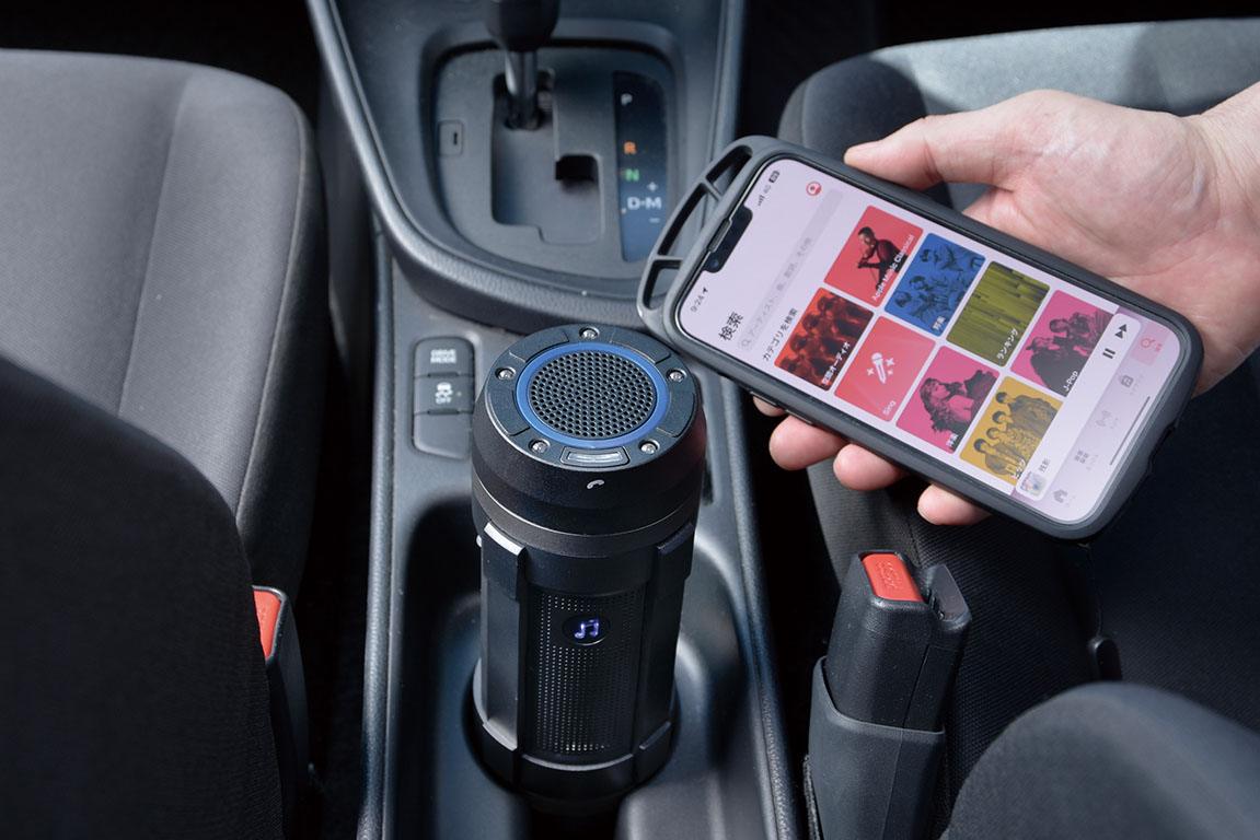 ▲スマホとBluetooth接続し、ワイヤレススピーカーとして利用。ドリンクホルダーに納まって便利