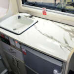 ▲深底のFRPシンク(流し)に備わる蛇口はキッチン上部の窓から車外に引き出せて、外部シャワーとして使える